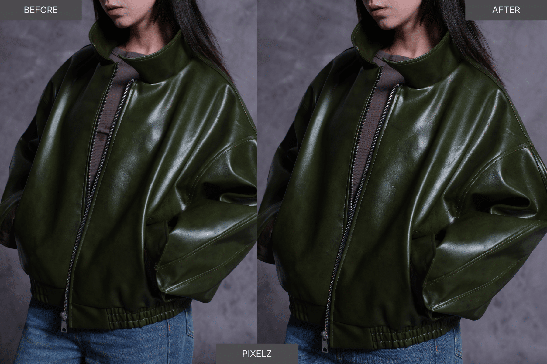 The richness of the leather was enhanced, giving the jacket a deeper, more even green tone while preserving its natural texture and sheen. Pixelz also subtly reduced distracting creases and imperfections, making the garment look smoother and more refined without crossing into an overedited, artificial look. The lighting and contrast were also balanced more carefully, helping the product stand out with a clean, professional finish. Overall, the final image looked consistent with high e-commerce standards, showing that Pixelz can confidently handle detailed apparel retouching and deliver quality results suitable for demanding online brands.