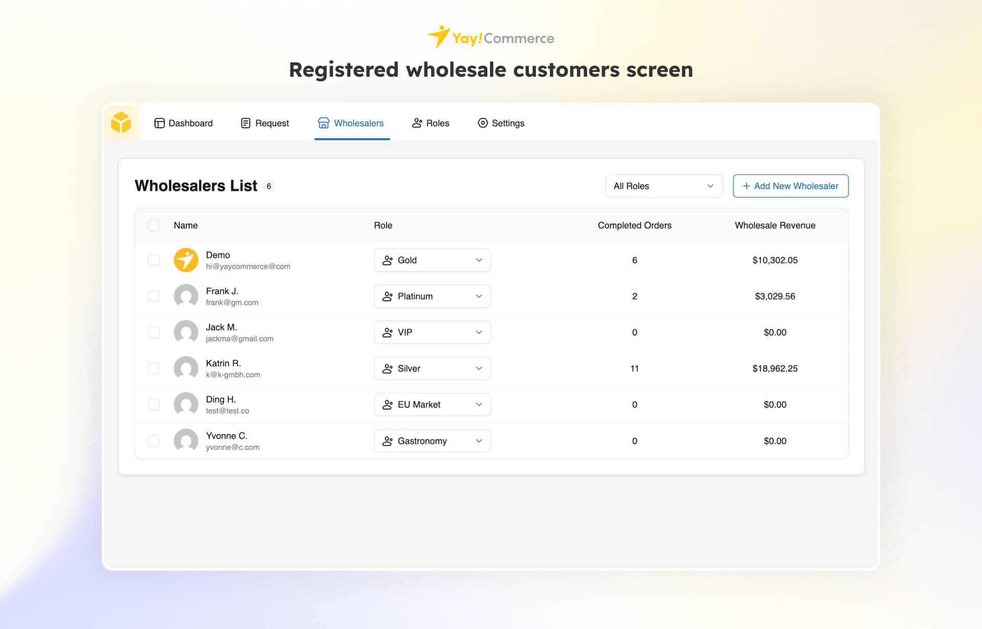 Approved requests will be removed from the Requests screen, and the customer will appear in the Wholesalers list with the default role.