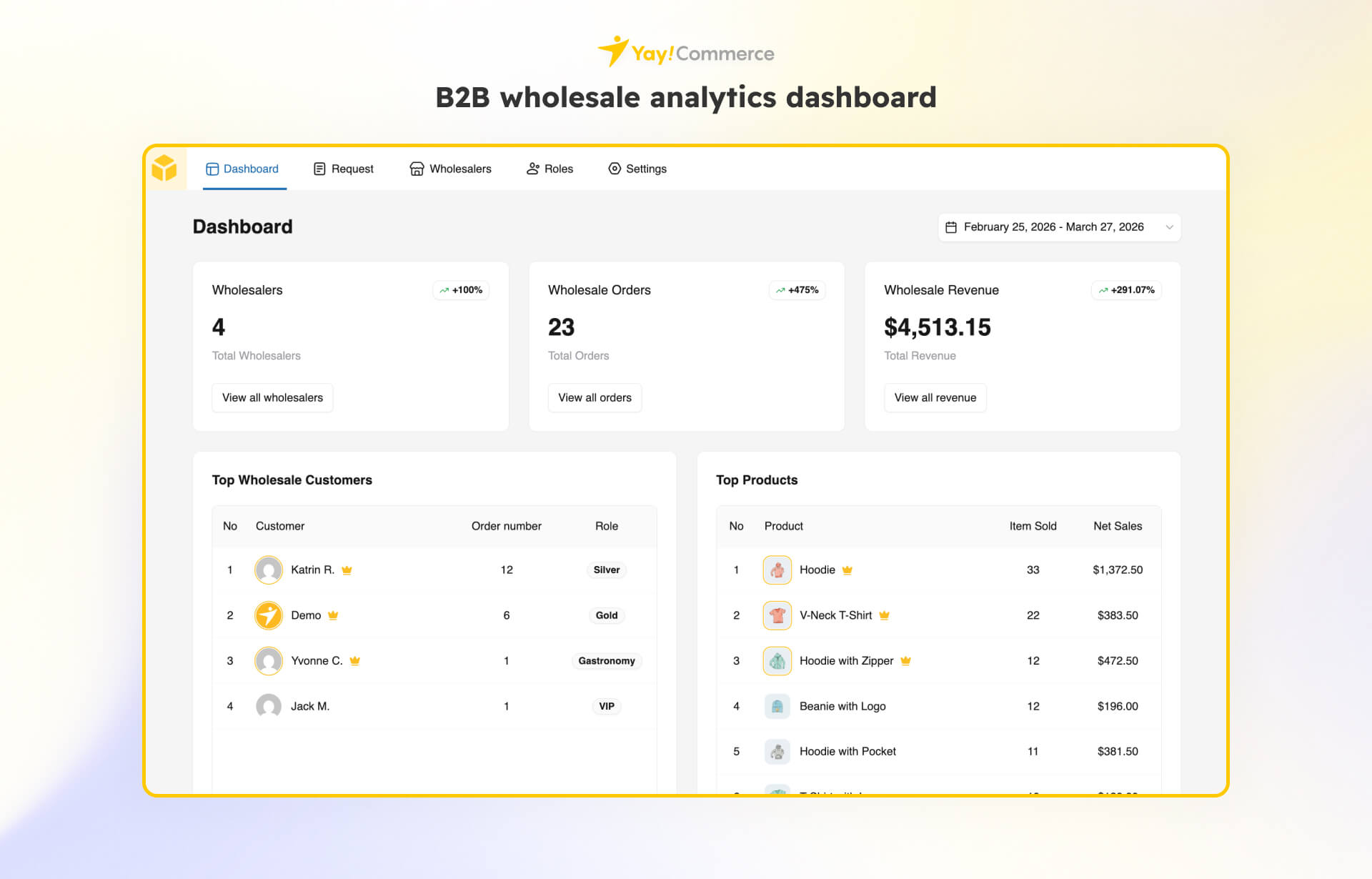 The dashboard shows wholesale-specific metrics for any date range you select, with automatic comparison to the previous period.